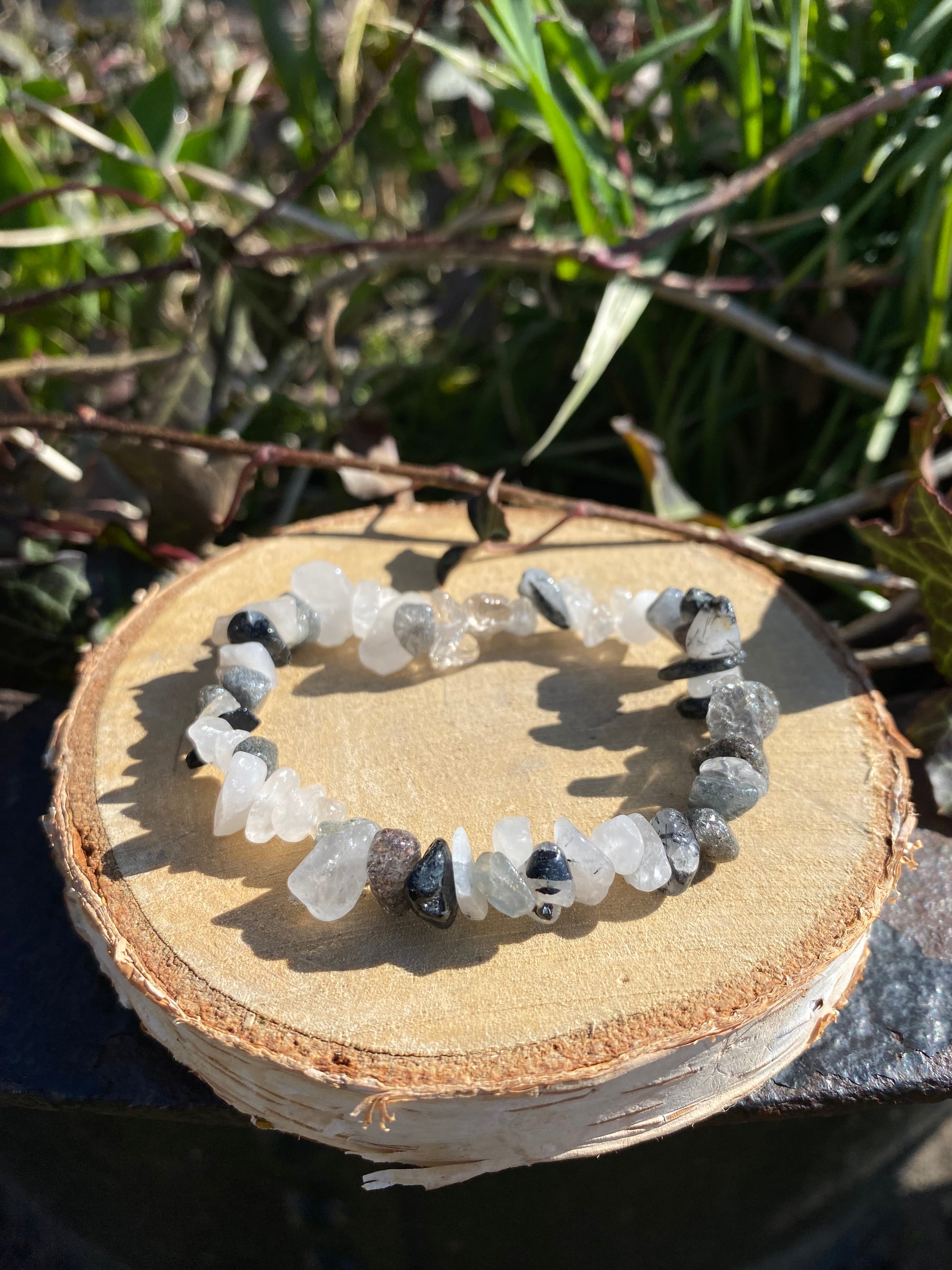 Le quartz avec inclusion de tourmaline noire permet de protéger des ondes (que ce soit les énergies de personnes, de lieux...) et en cas de perturbations géobiologiques.