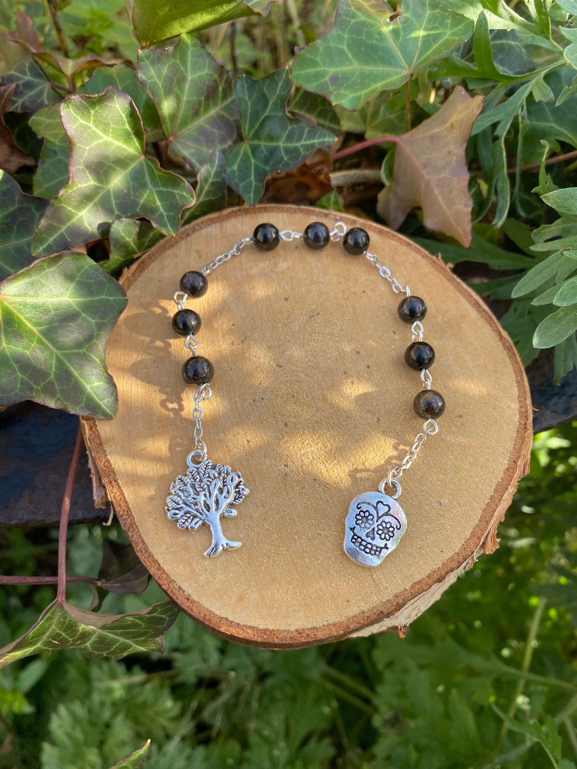 Une breloque crâne qui représente les ancêtres, et une breloque arbre représentant les racines (arbre généalogique).